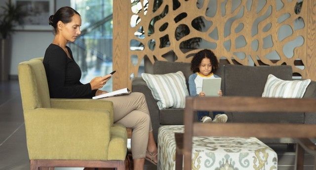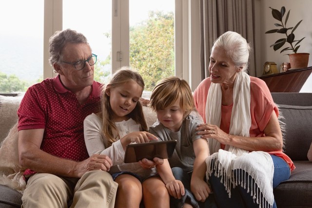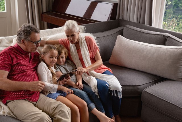 多代家庭在舒适的家中使用沙发上的数字平板电脑