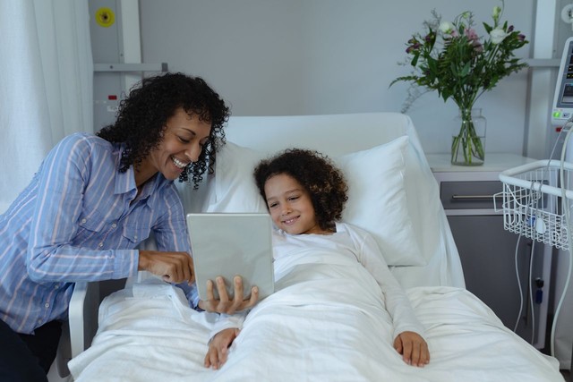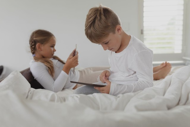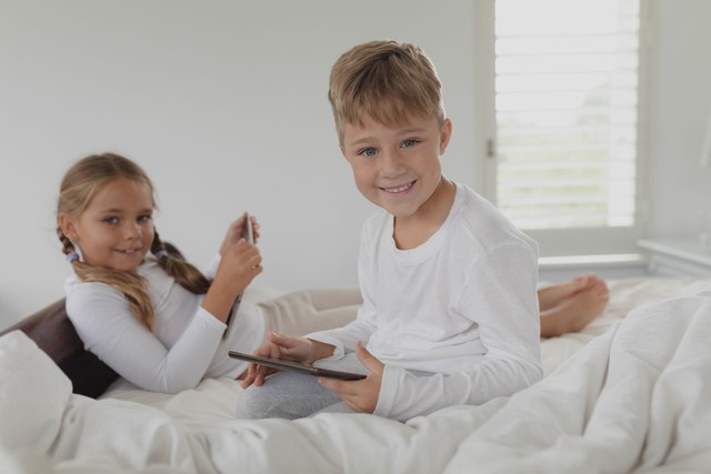 兄弟姐妹在卧室的床上使用数字平板电脑