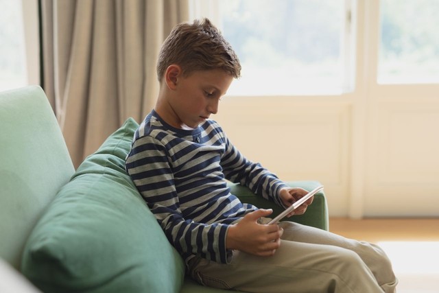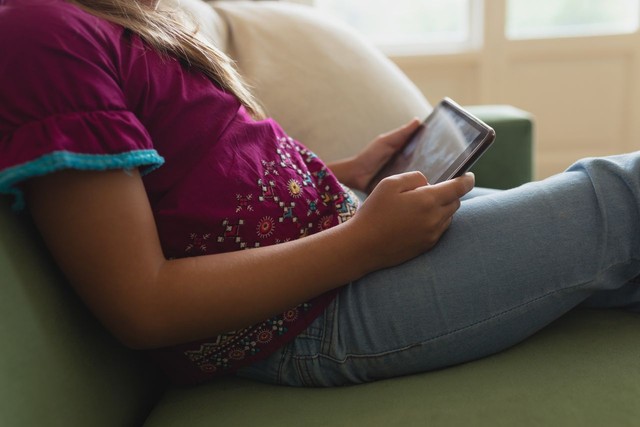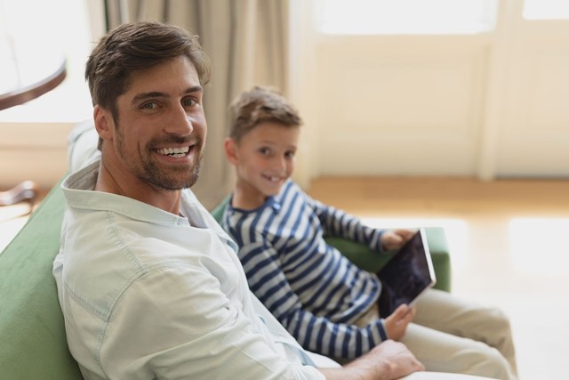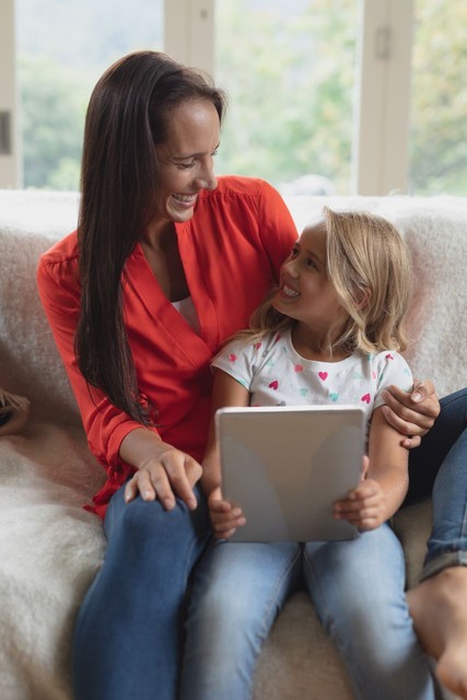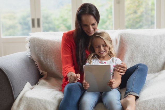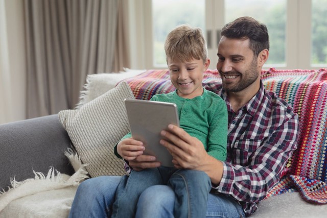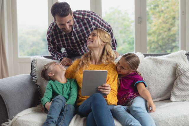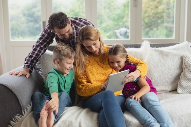 白人家庭在舒适的家中沙发上使用数字平板电脑