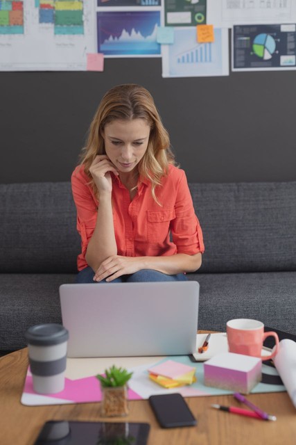活跃的老年女性在沙发上放松,在客厅使用数字平板电脑