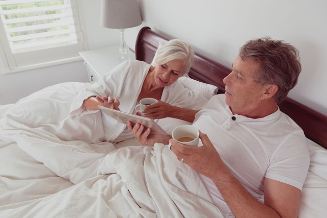 活跃的老年夫妇在舒适的家中躺在卧室的床上使用数字平板电脑