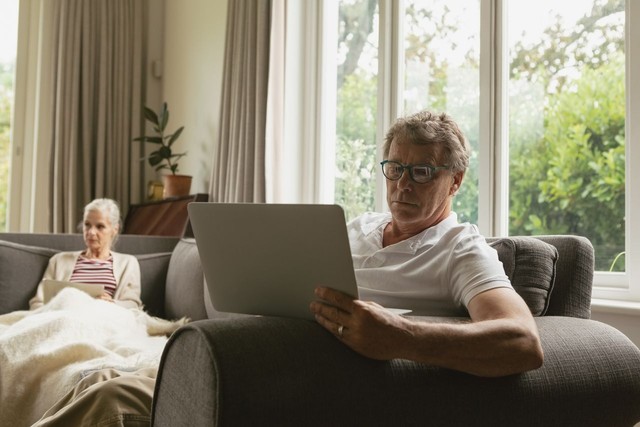 活跃的老人坐在沙发上,在舒适的家的客厅里使用笔记本电脑