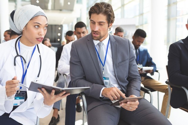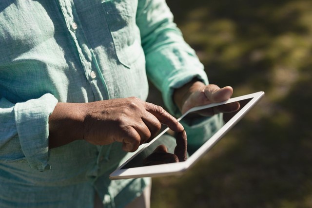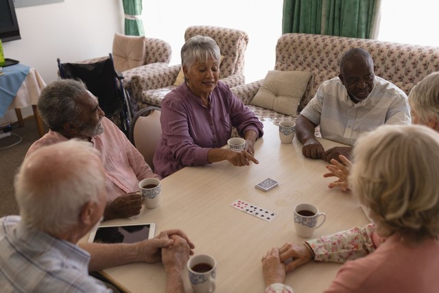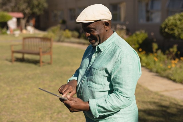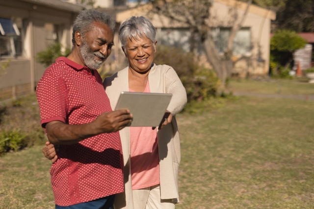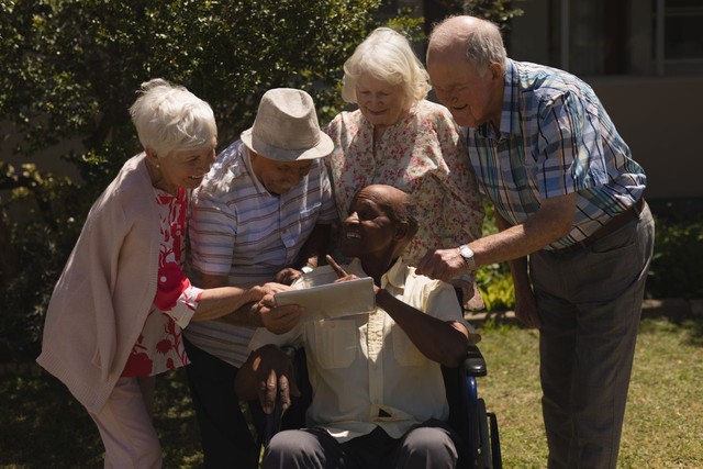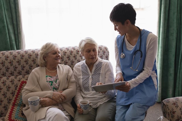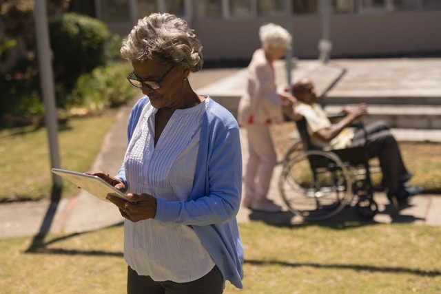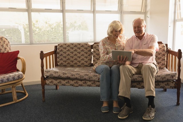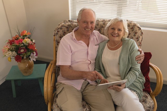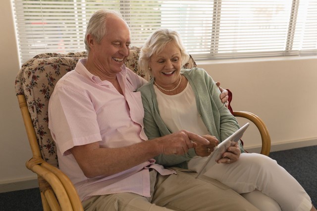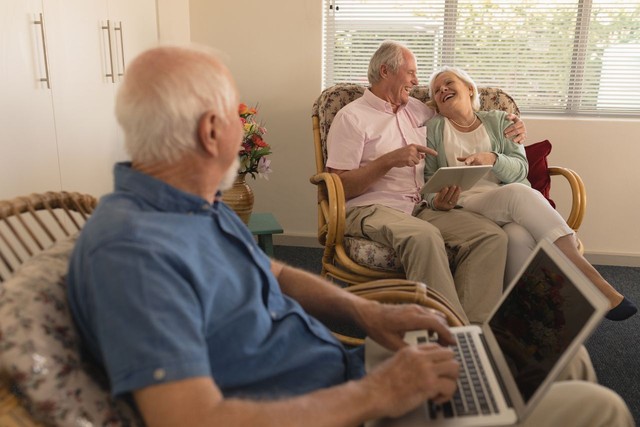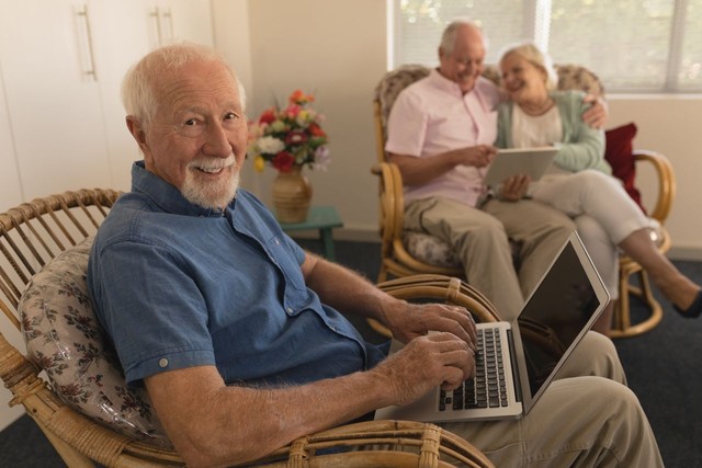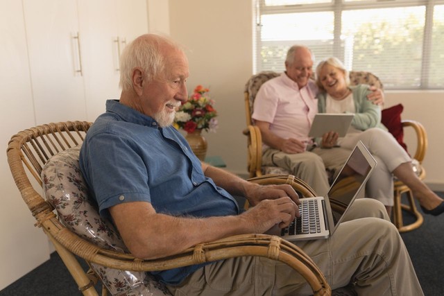 老人使用笔记本电脑,而老人夫妇在疗养院使用数字平板电脑