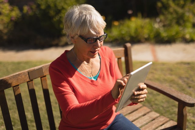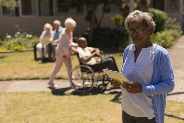 带着数字平板电脑在花园里看着相机的老年妇女的正视图