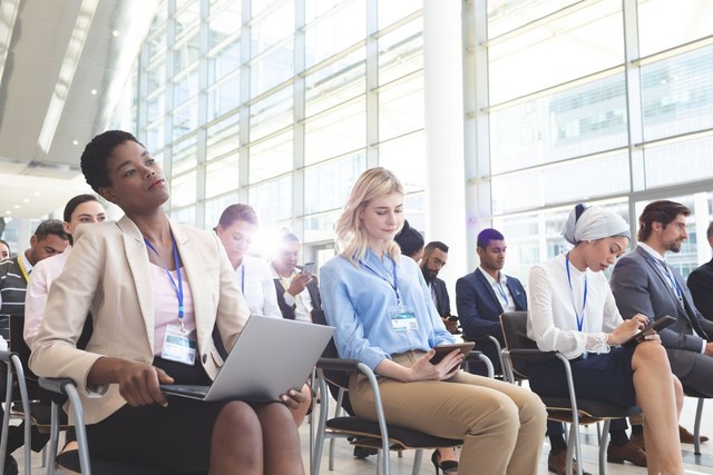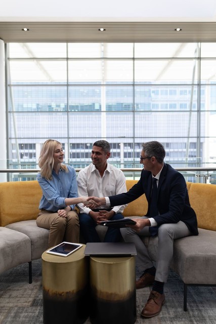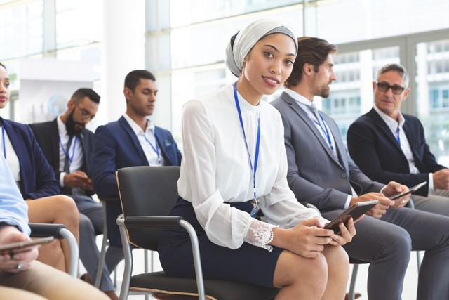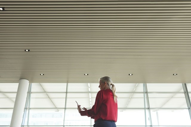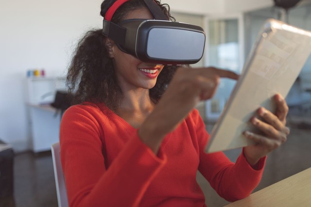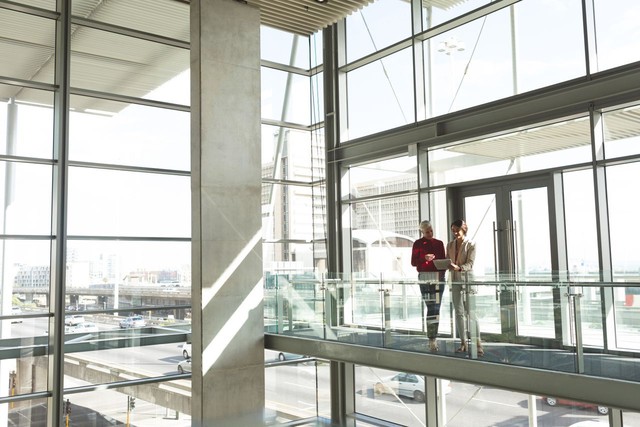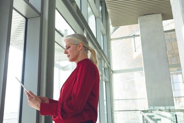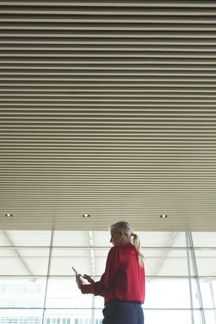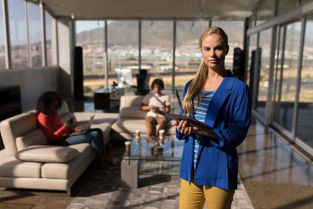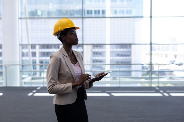 非洲裔美国年轻女建筑师,带着数字平板电脑站在现代办公室里
