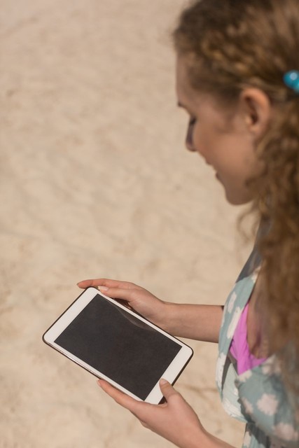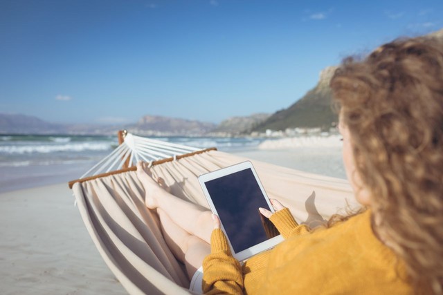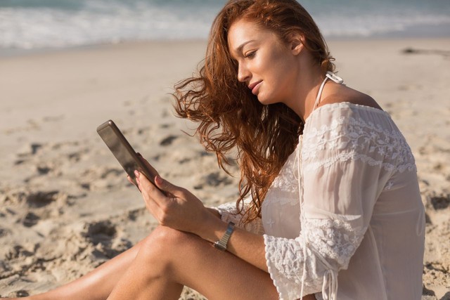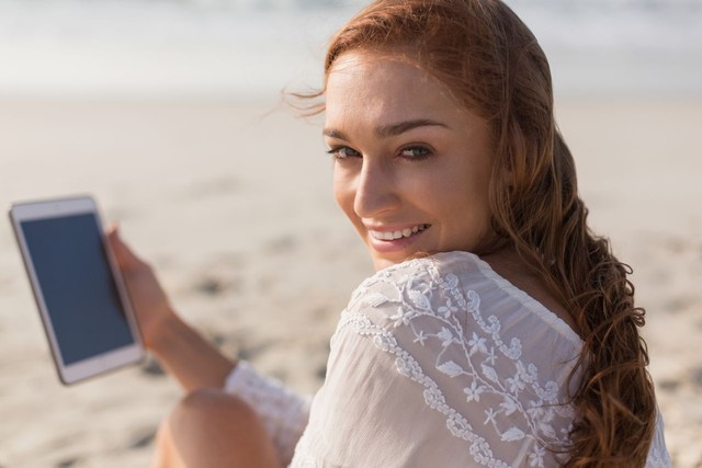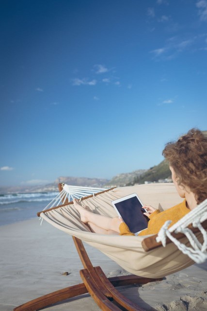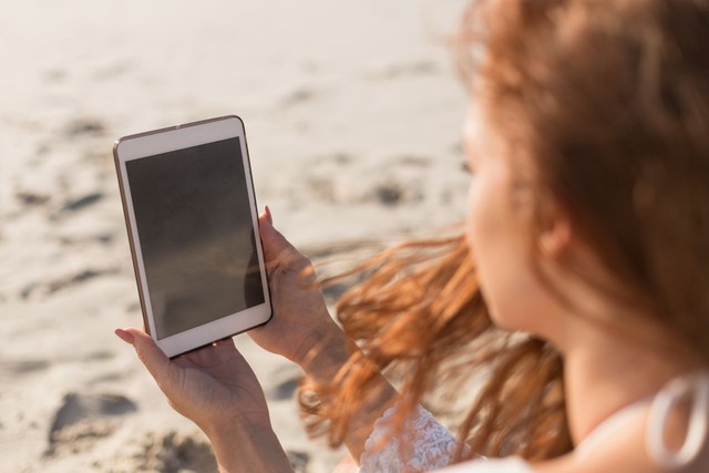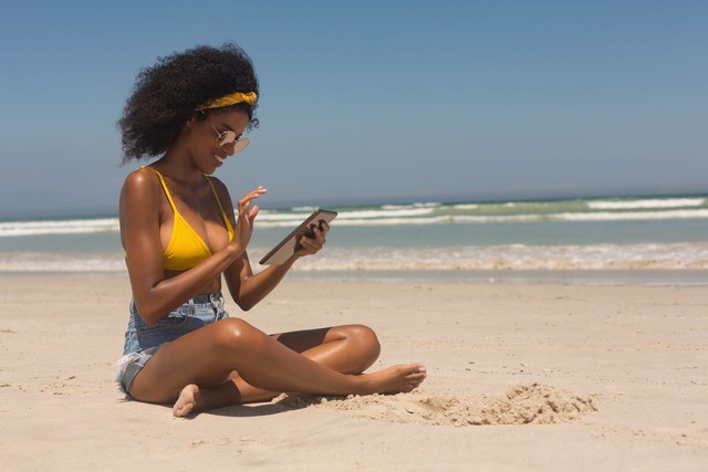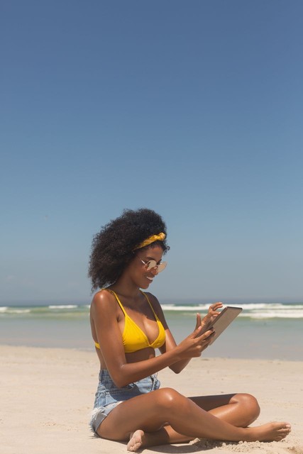 年轻的非裔美国妇女穿着黄色比基尼,戴着太阳镜,使用数字平板电脑