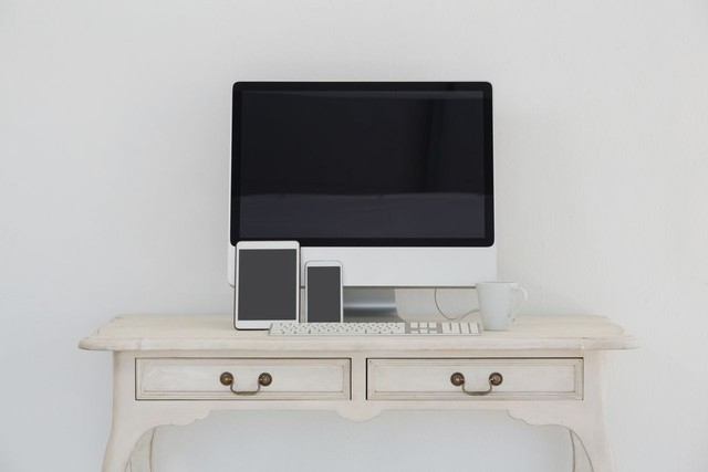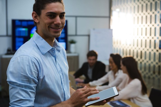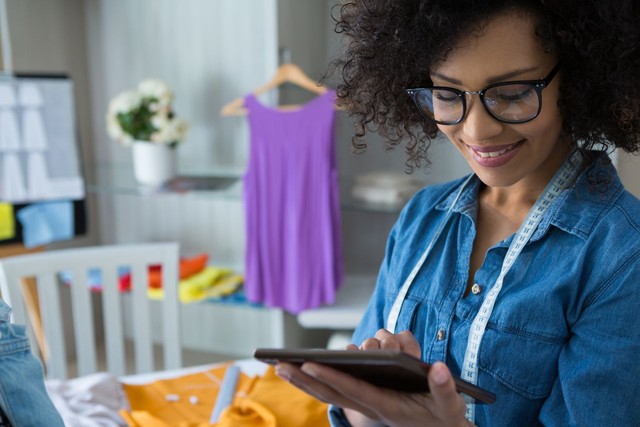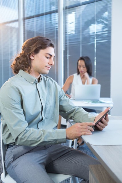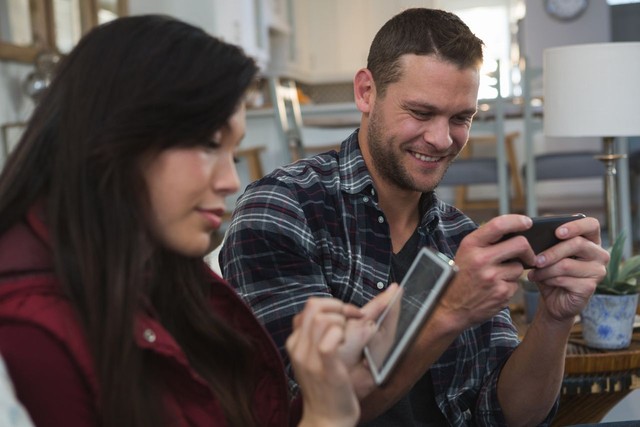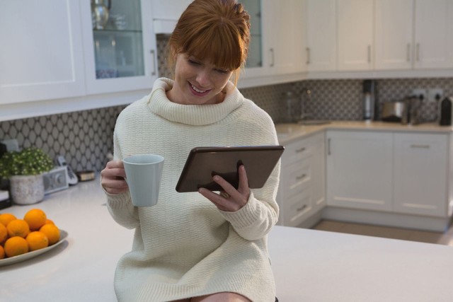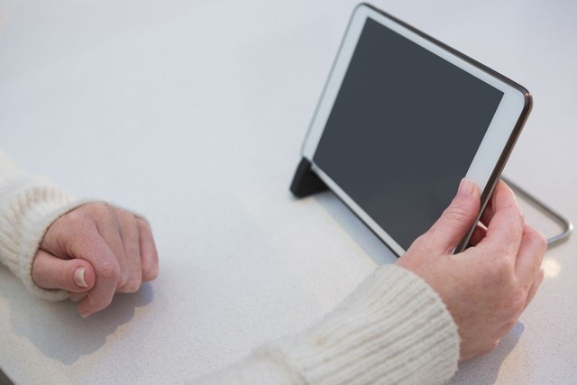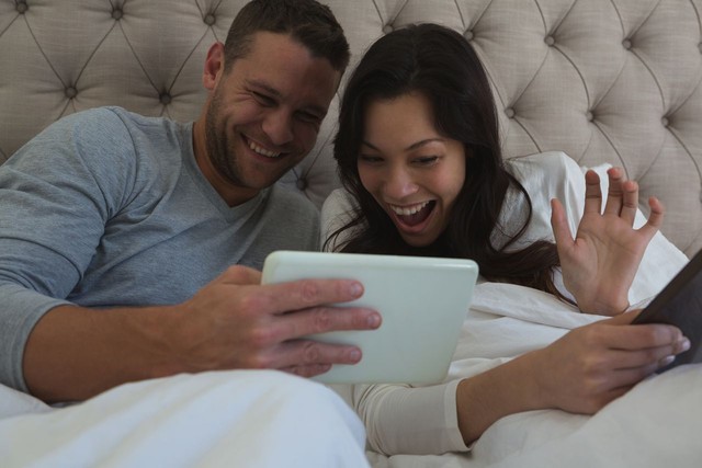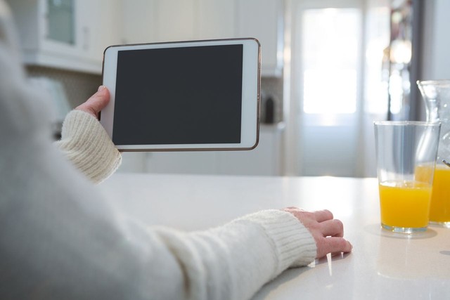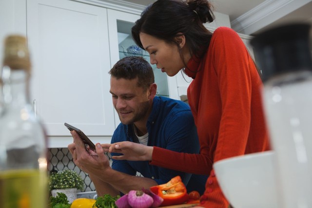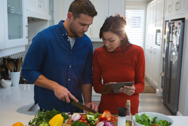 夫妇在厨房使用数字平板电脑时切蔬菜