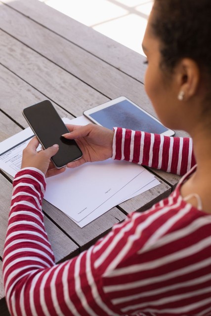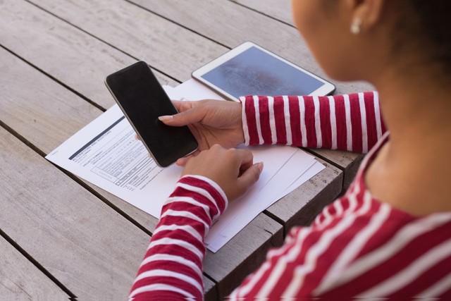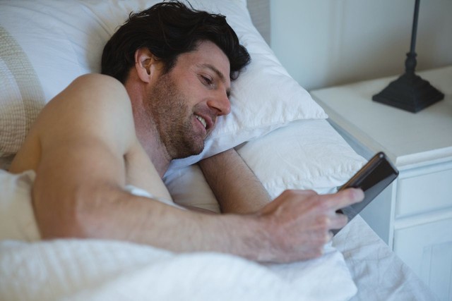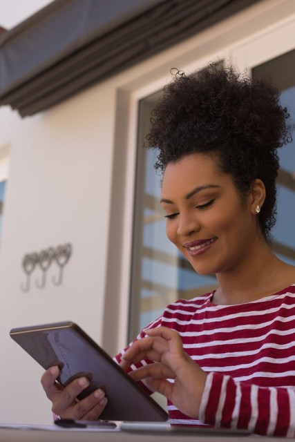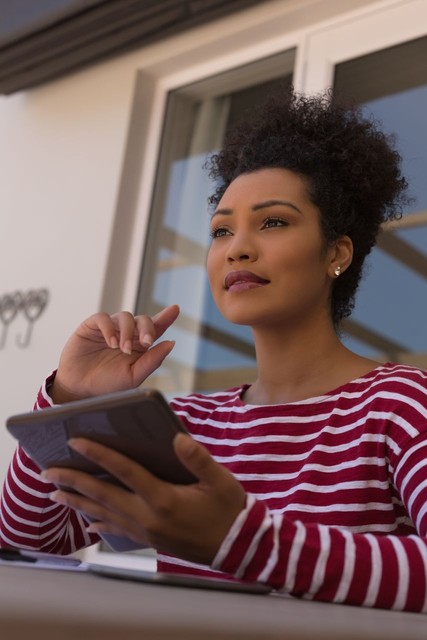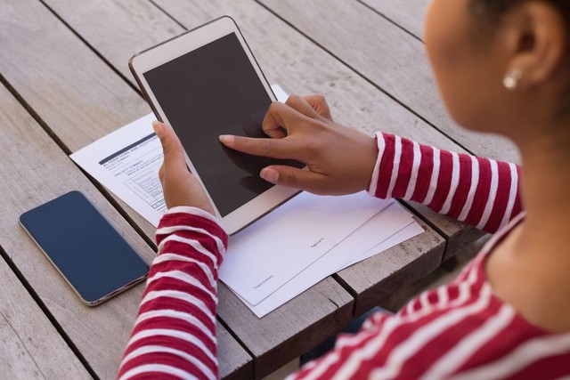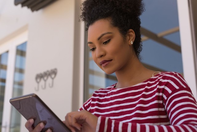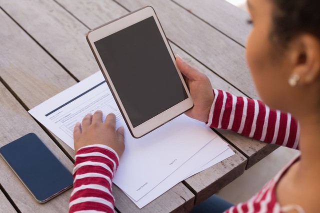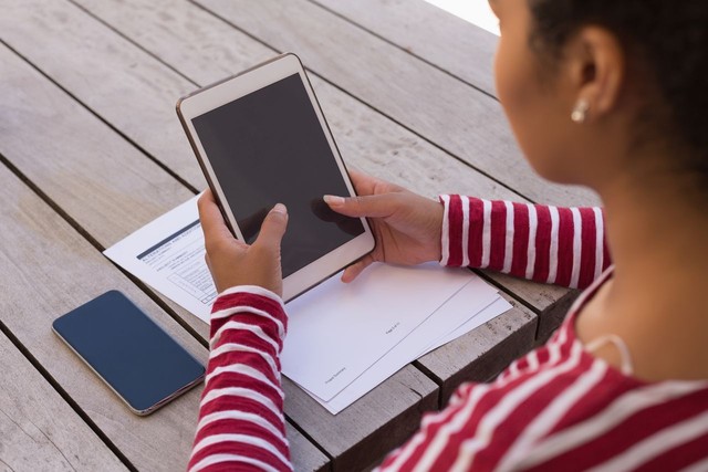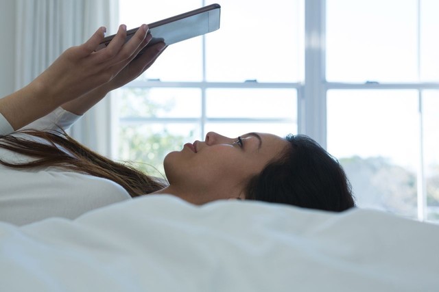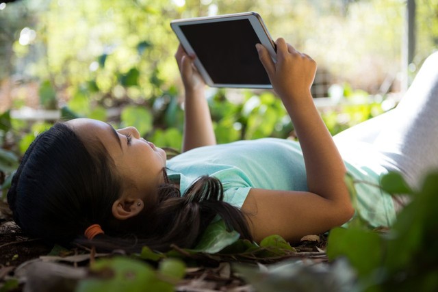阳光明媚的日子里,小女孩躺在地上用平板电脑
