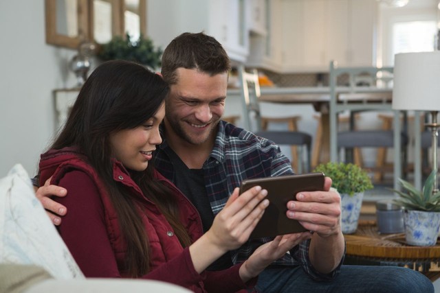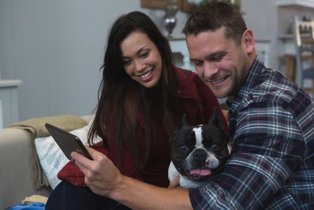 夫妇在客厅里和他们的宠物狗一起使用数字平板电脑