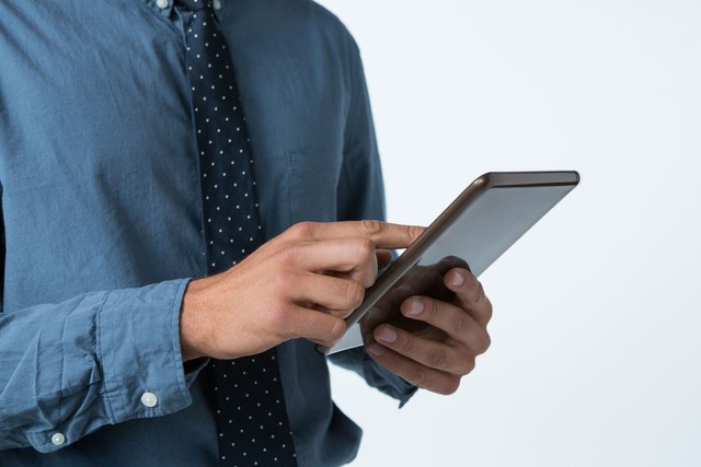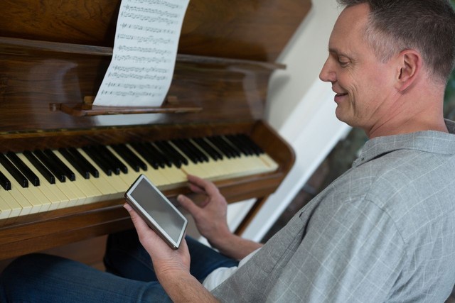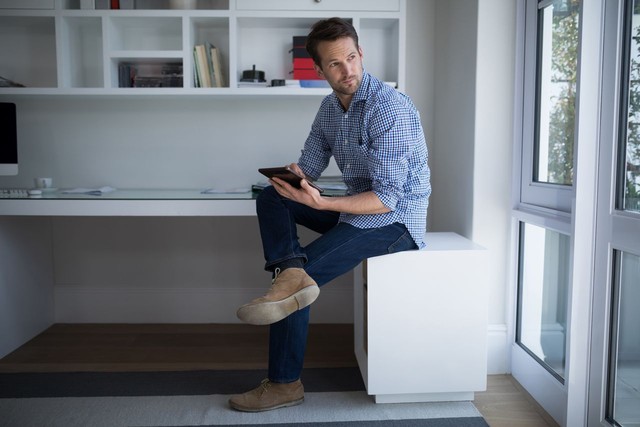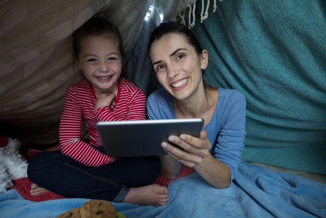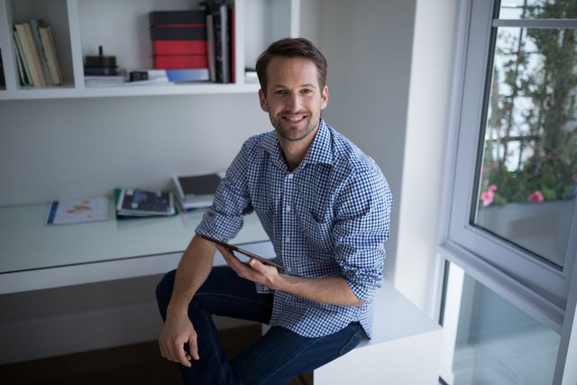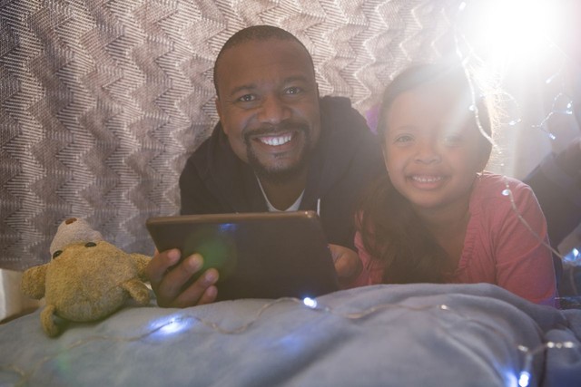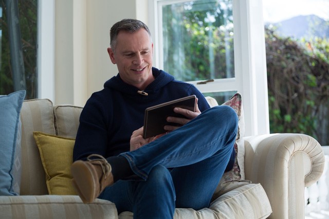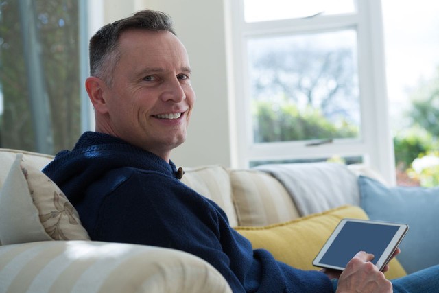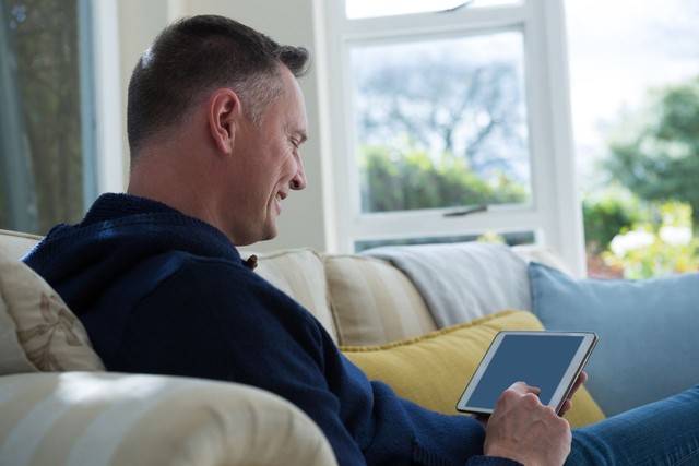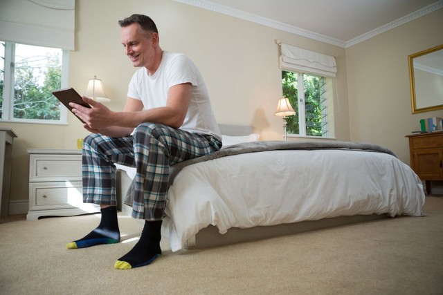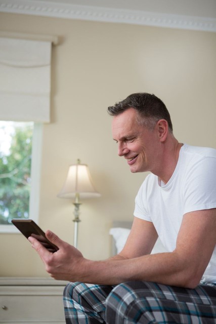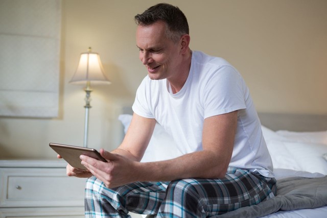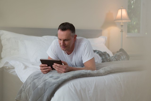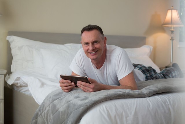微笑的男人躺在床上,在卧室里使用数字平板电脑