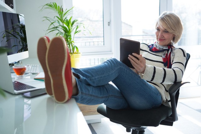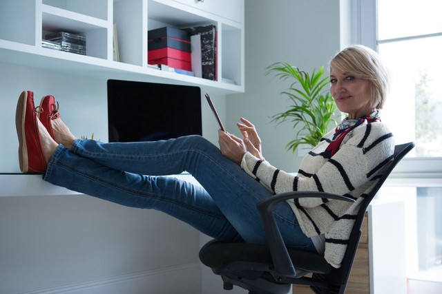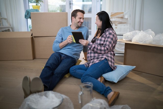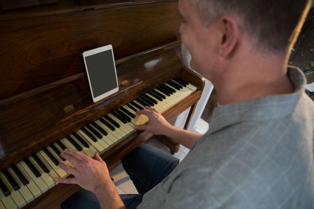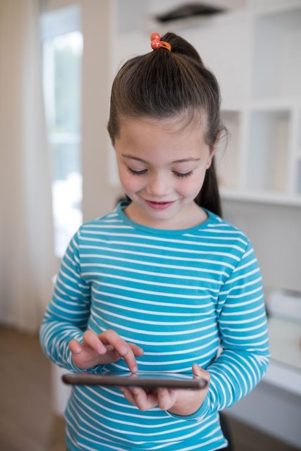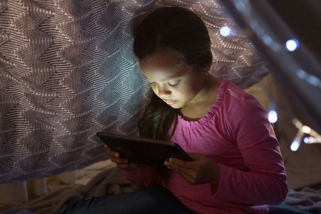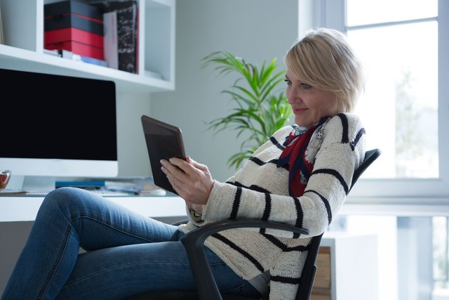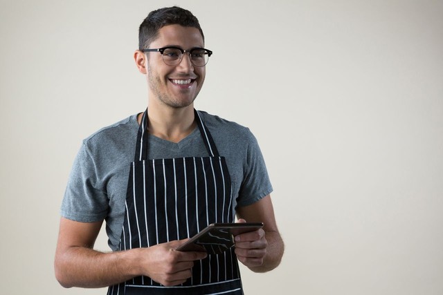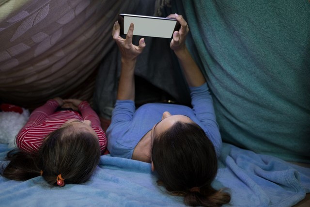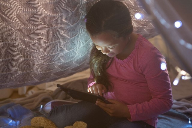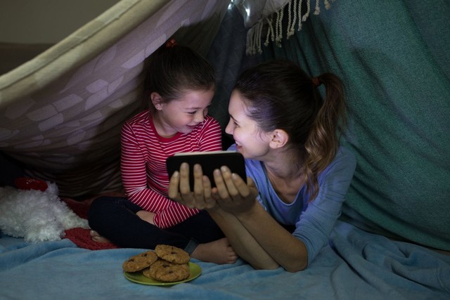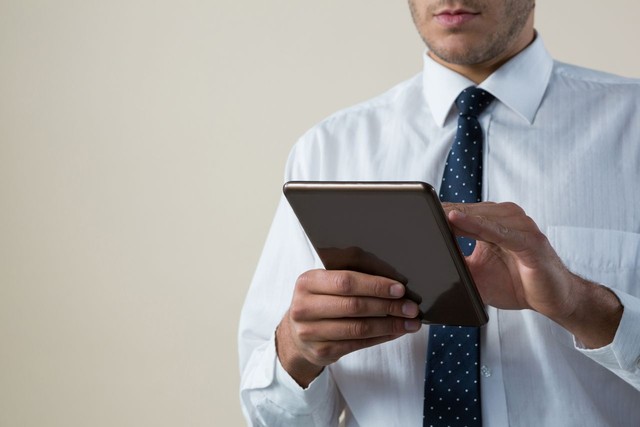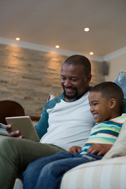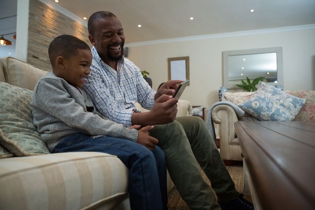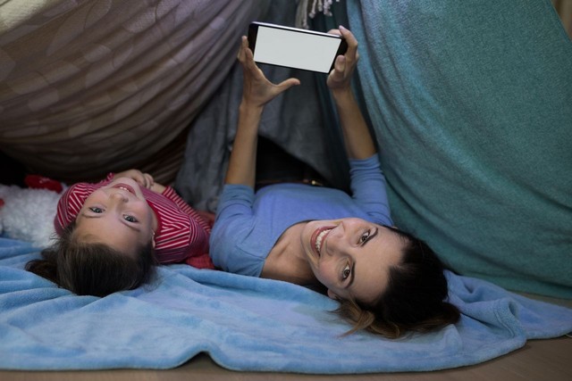 微笑的男人躺在床上,在卧室里使用数字平板电脑