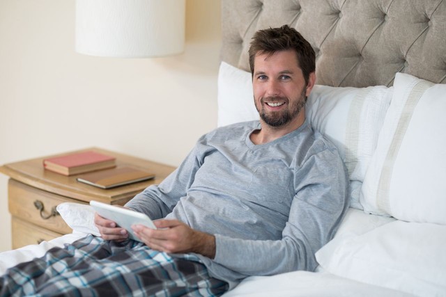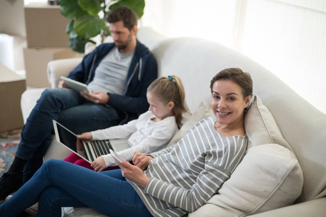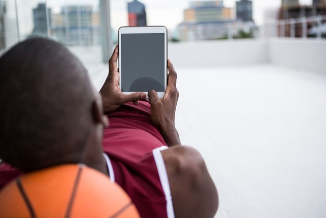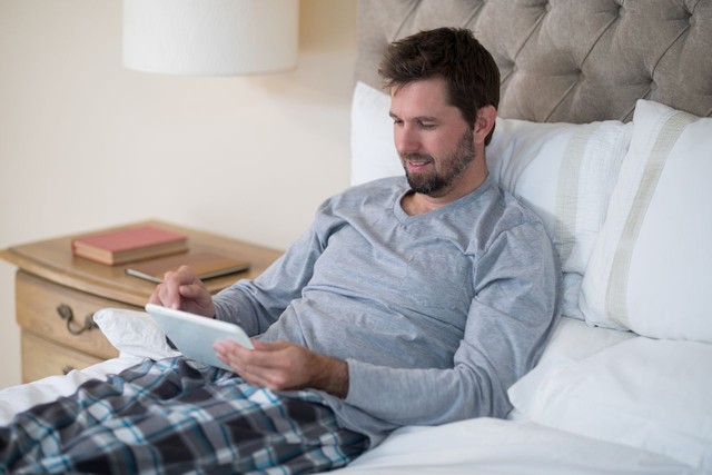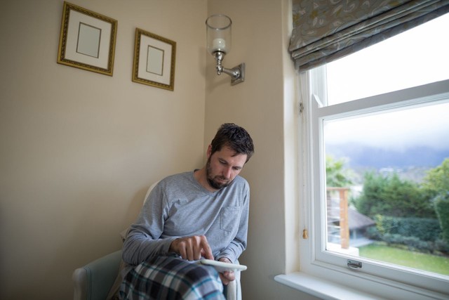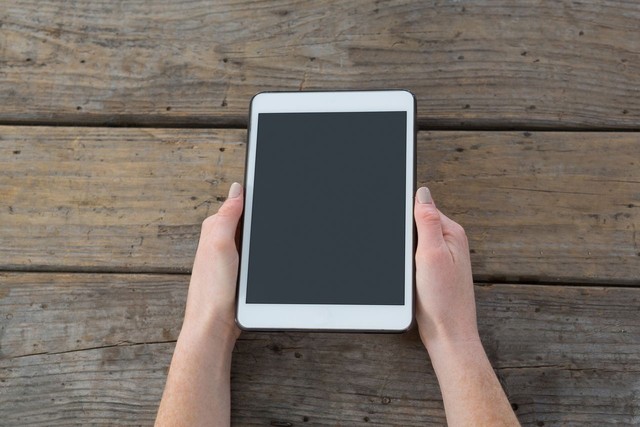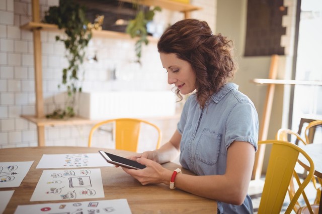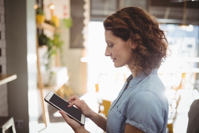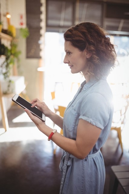 女性顾客在咖啡馆使用平板电脑的侧视图