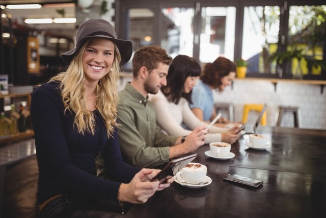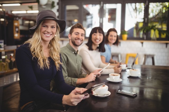 微笑的年轻女子和朋友坐在咖啡馆的桌子旁
