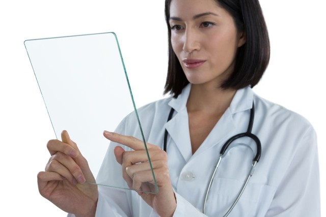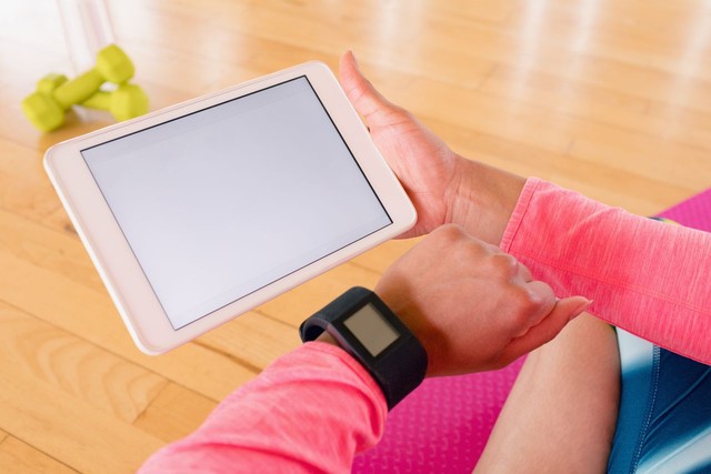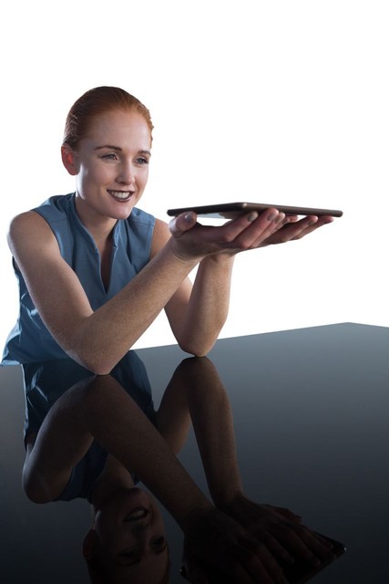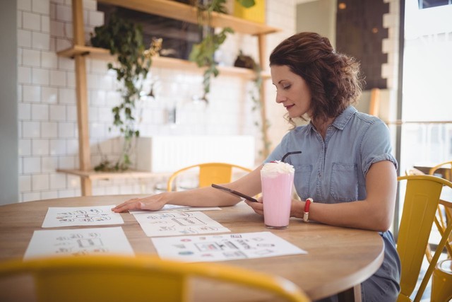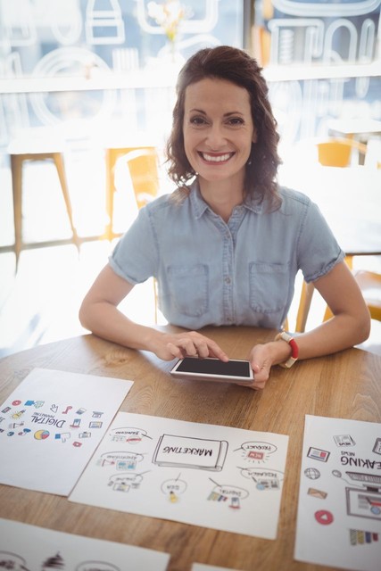 微笑的年轻女子坐在咖啡店里,手里拿着数字平板电脑和文件