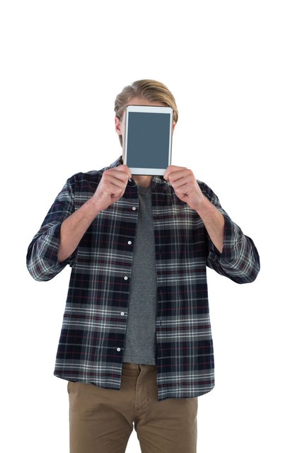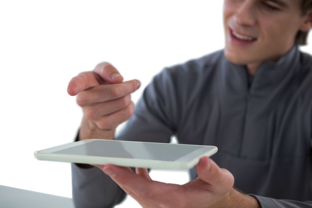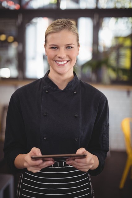 微笑的年轻漂亮女服务员手持数字平板电脑的肖像