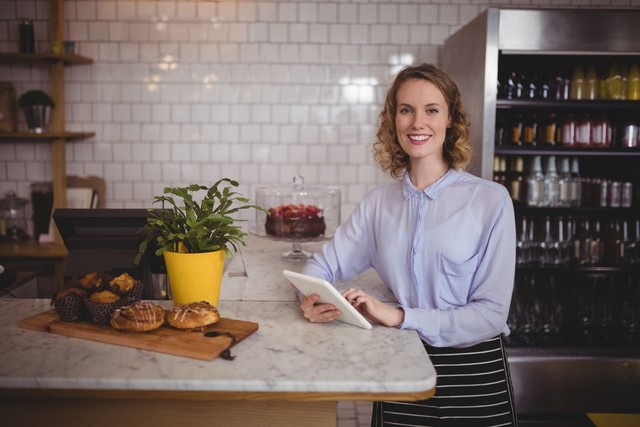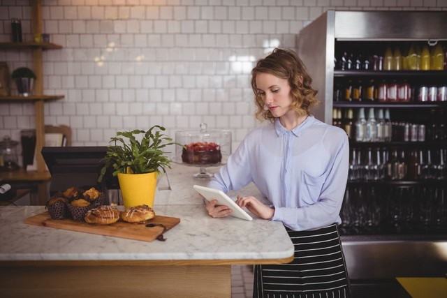 站在柜台旁使用数字平板电脑的迷人年轻女服务员