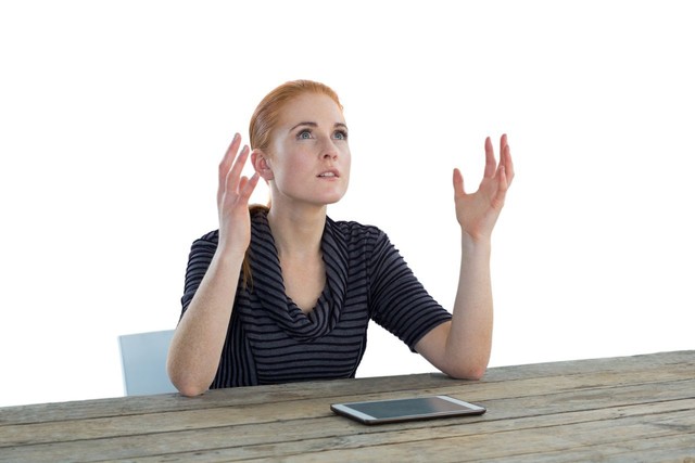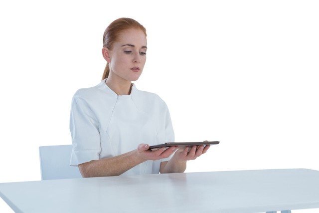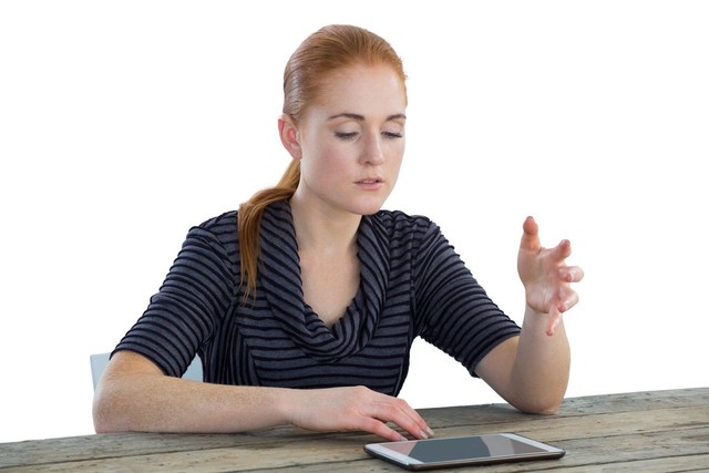 年轻女子坐在桌子旁用图表纸使用数字桌子