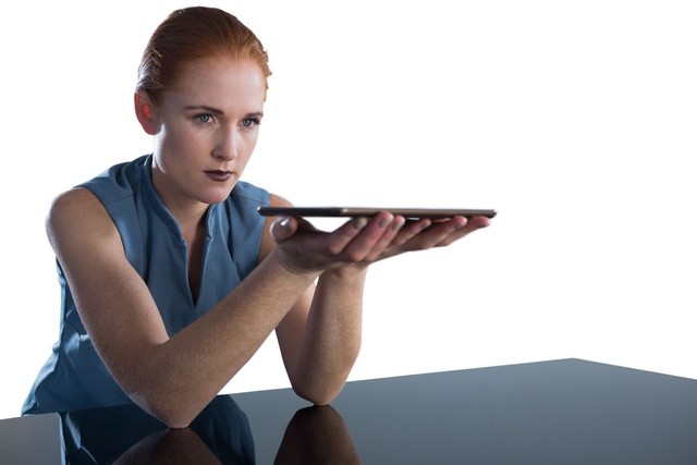 年轻女子在咖啡馆使用平板电脑的侧视图