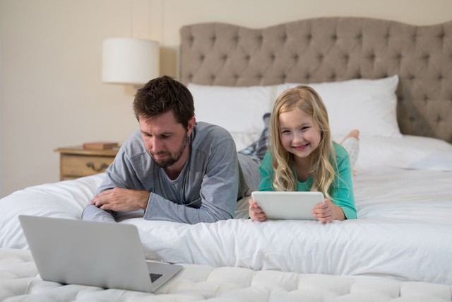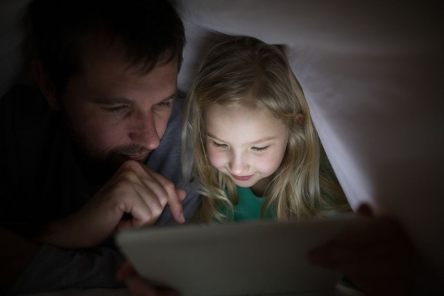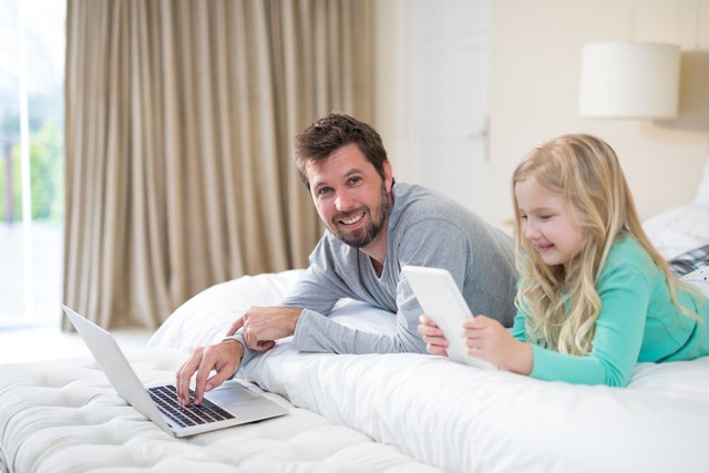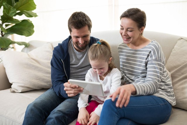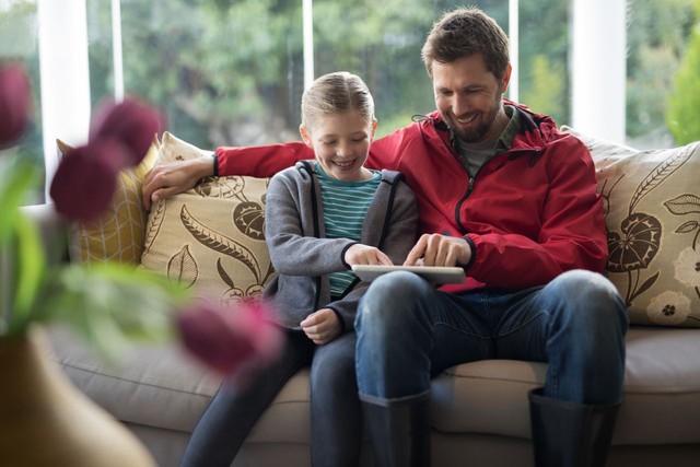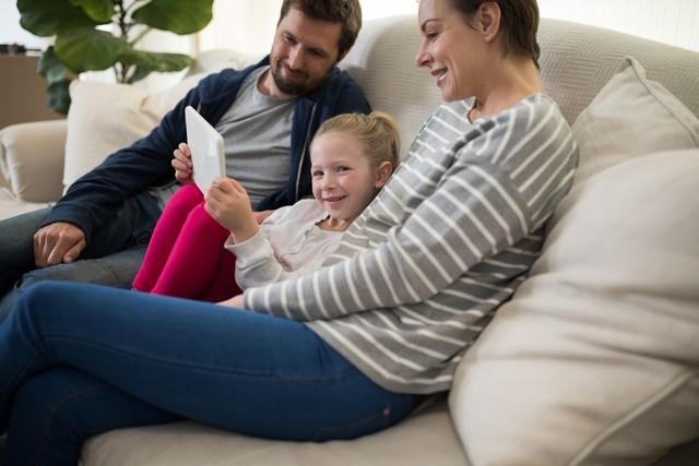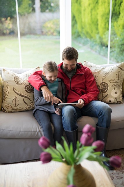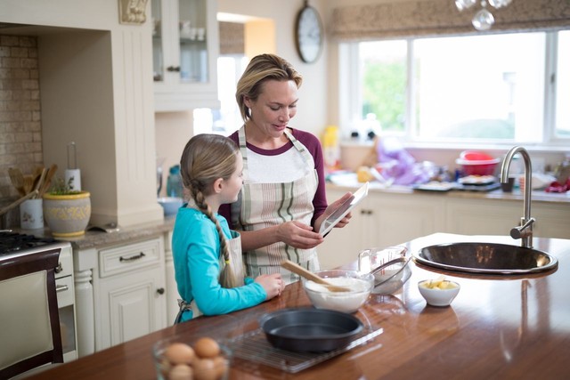 微笑的母亲和女儿在准备饼干时使用数字平板电脑
