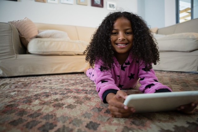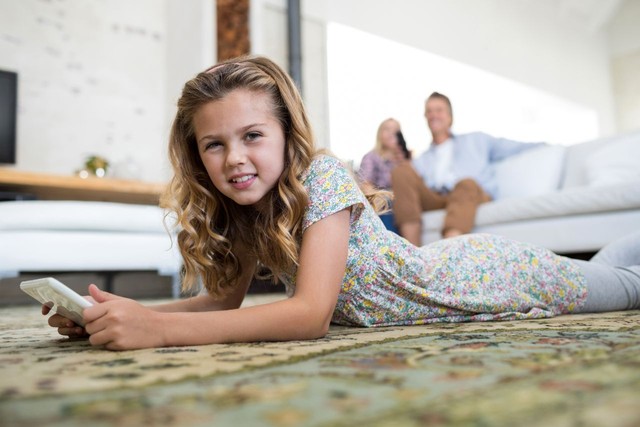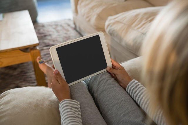 女孩在客厅使用数字平板电脑
