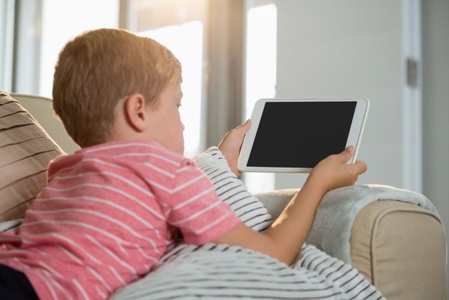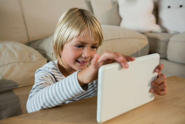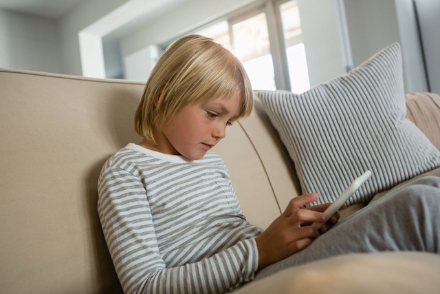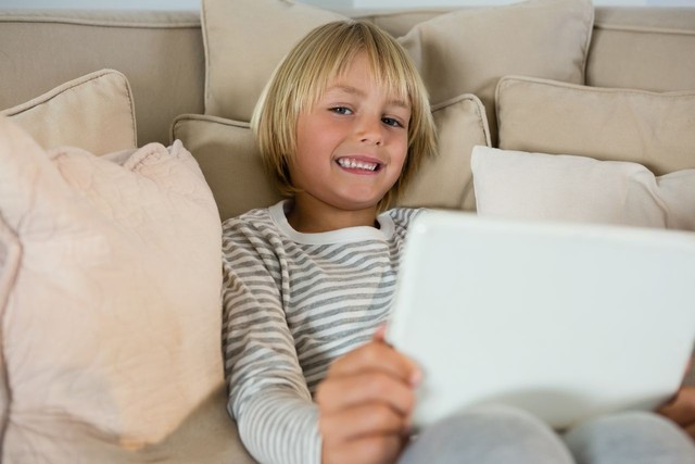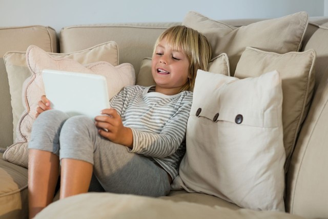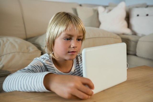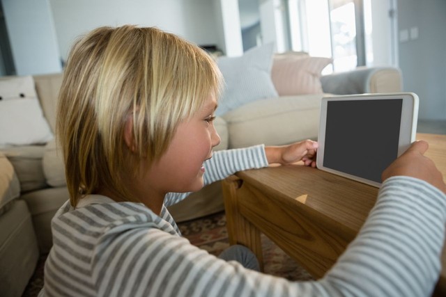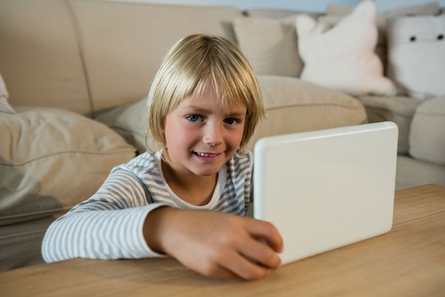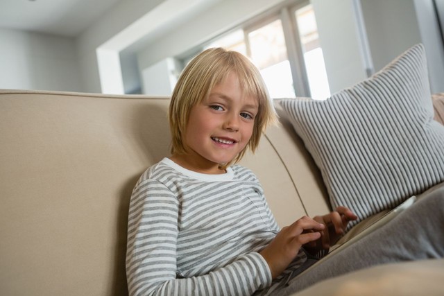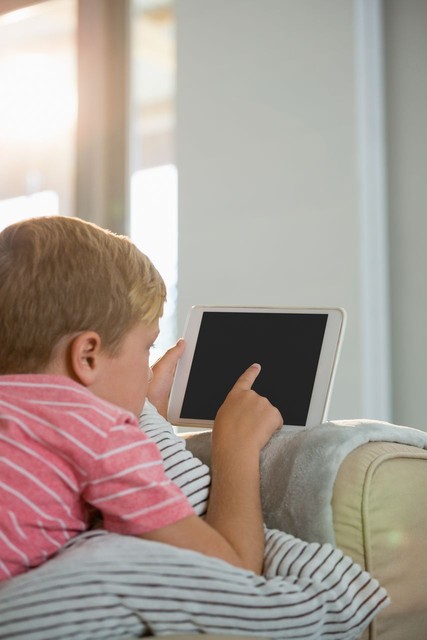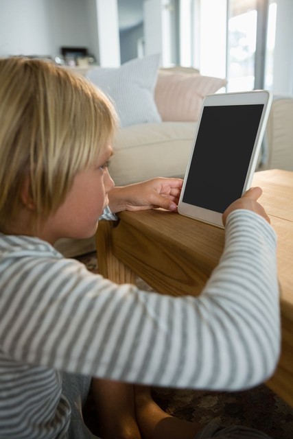 男孩在客厅使用数字平板电脑