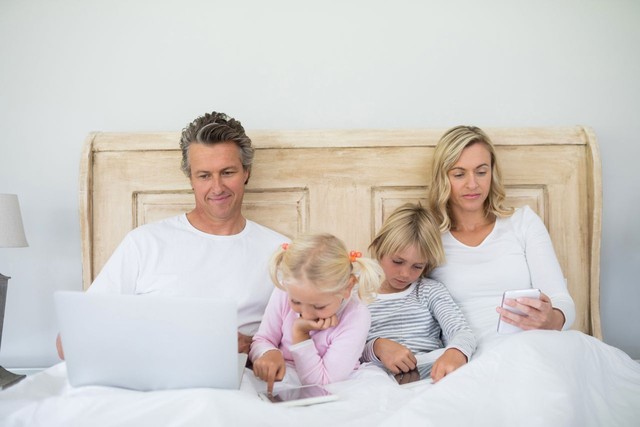 家庭在卧室的床上使用数字平板电脑、手机和笔记本电脑
