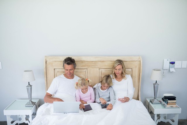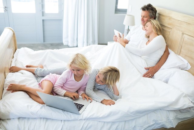 家庭在卧室的床上使用数字平板电脑和笔记本电脑