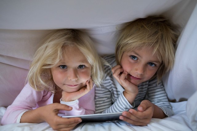 兄弟姐妹在卧室床上的毯子下使用数字平板电脑