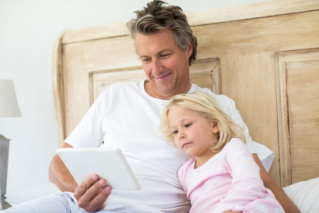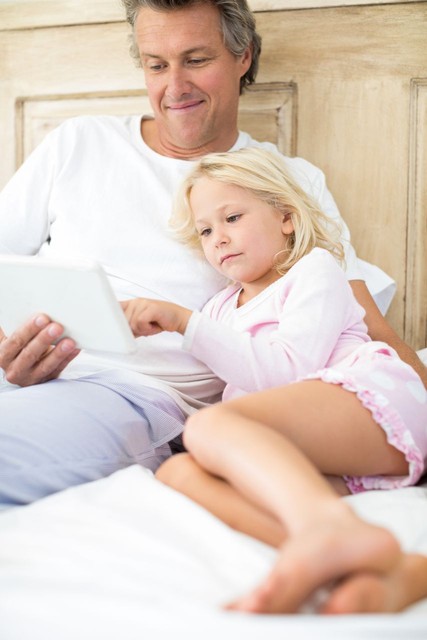 微笑的父女在床上使用数字平板电脑