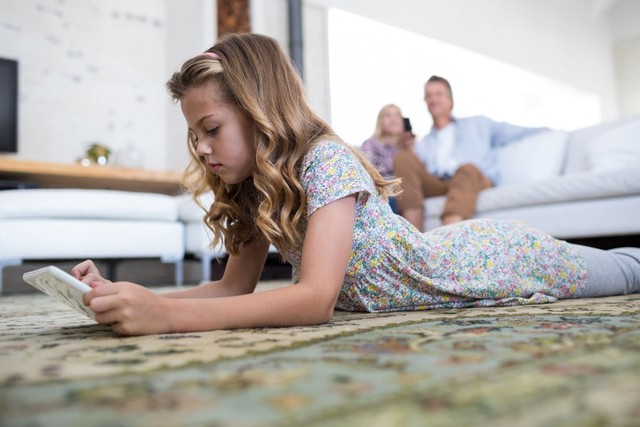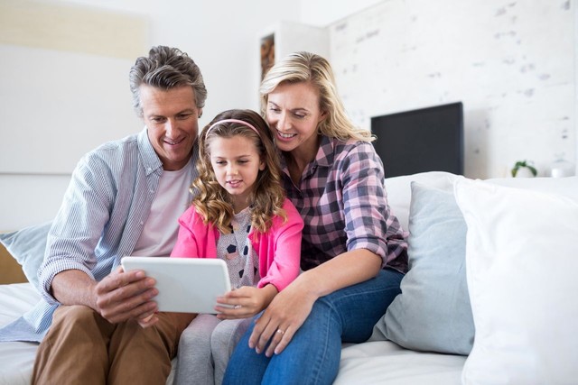 女儿在客厅使用数字平板电脑,而父母坐在沙发上