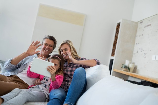 家庭在客厅的数字平板电脑上进行视频通话