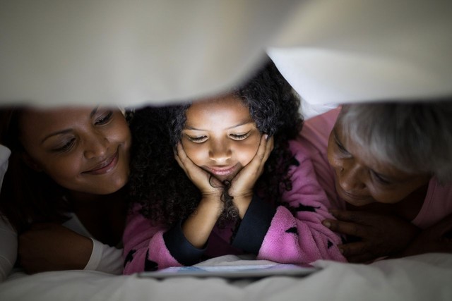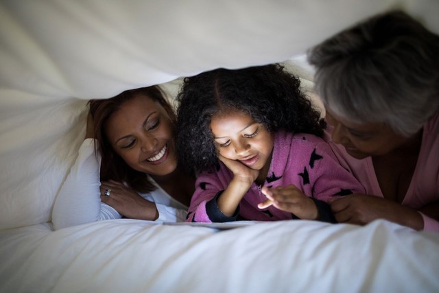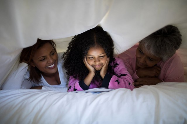 幸福的家庭在卧室的毯子下使用数字平板电脑