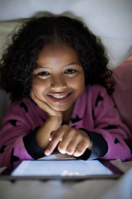 微笑的女孩在卧室的毯子下使用数字平板电脑