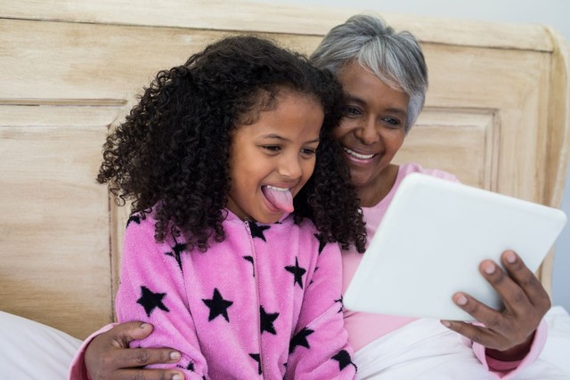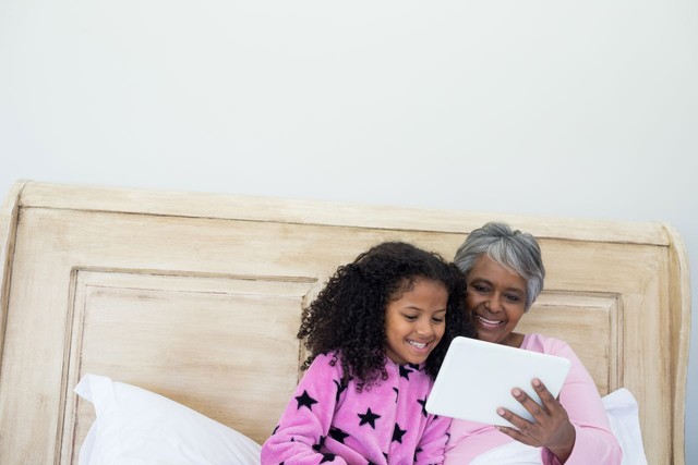 祖母和孙女在卧室里使用数字平板电脑