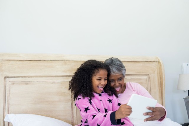 祖母和孙女在卧室的数字平板电脑上自拍