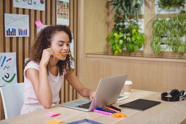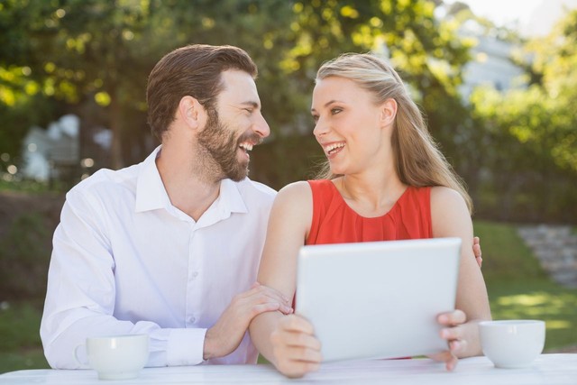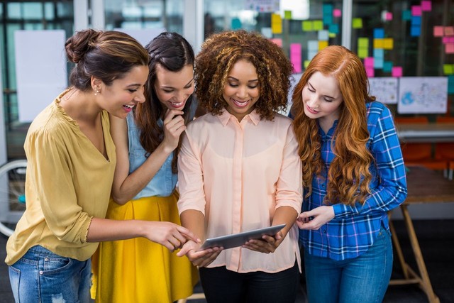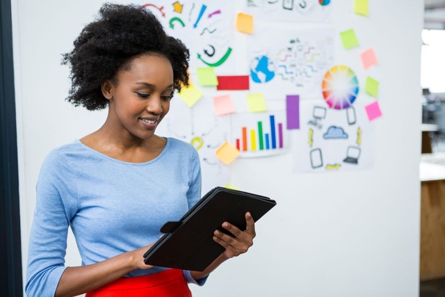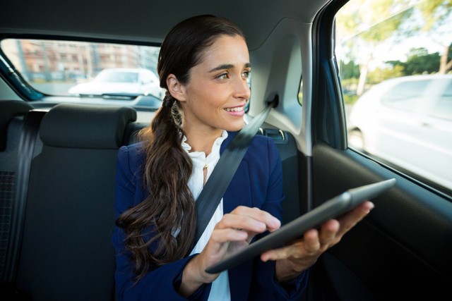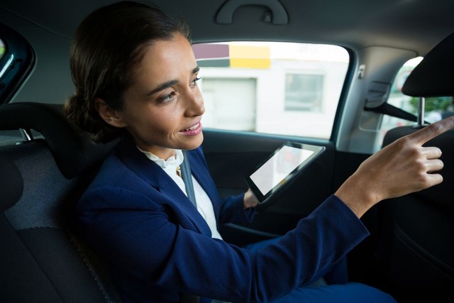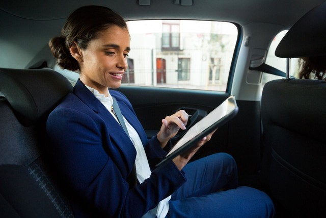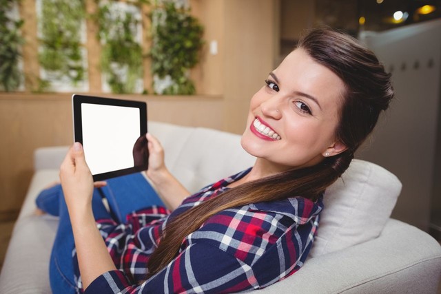 女高管在沙发上放松并使用数字平板电脑的肖像
