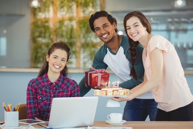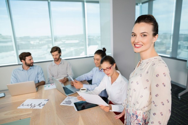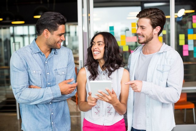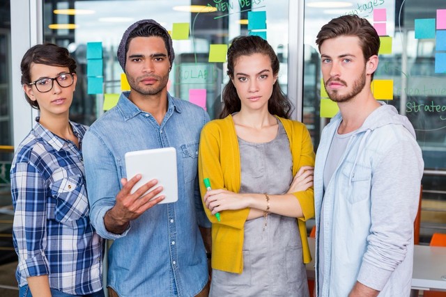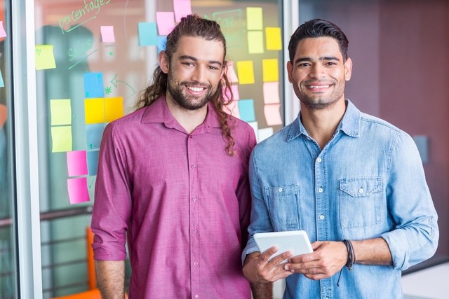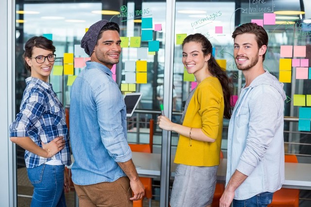 微笑的高管们在玻璃墙上的便利贴上讨论