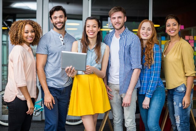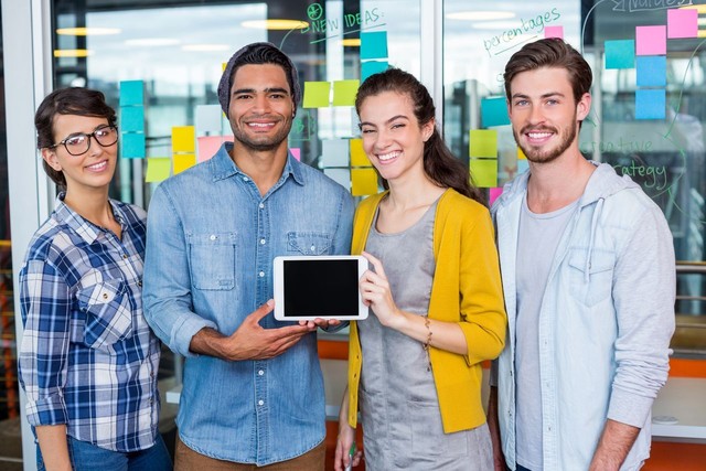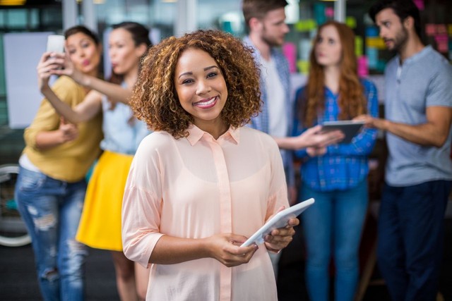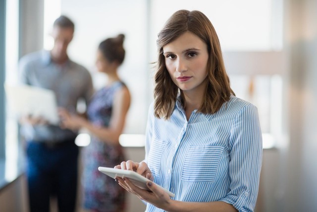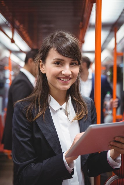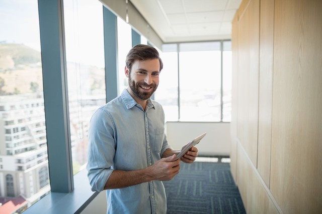走廊里微笑的商务主管使用数字平板电脑的肖像