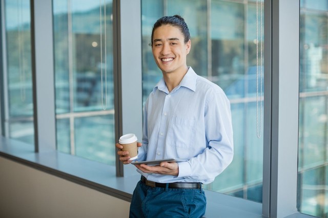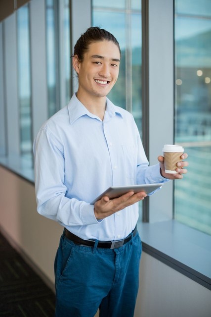 商务主管在办公室走廊喝咖啡时使用数字平板电脑