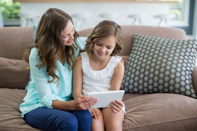 微笑的母女坐在沙发上,在客厅里使用数字平板电脑