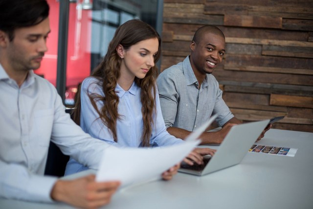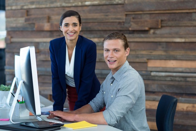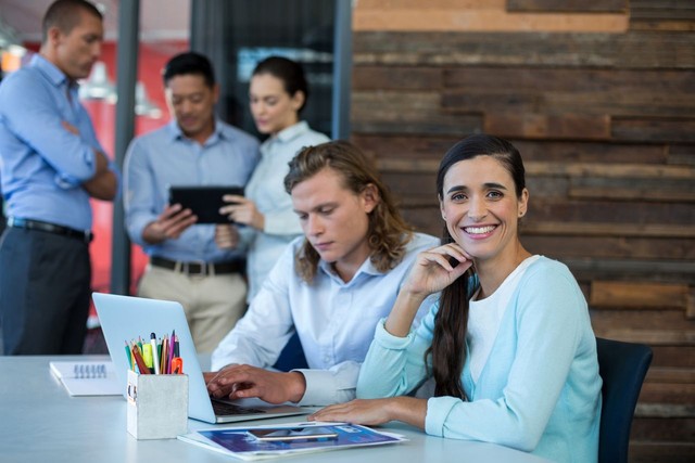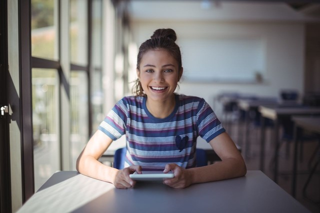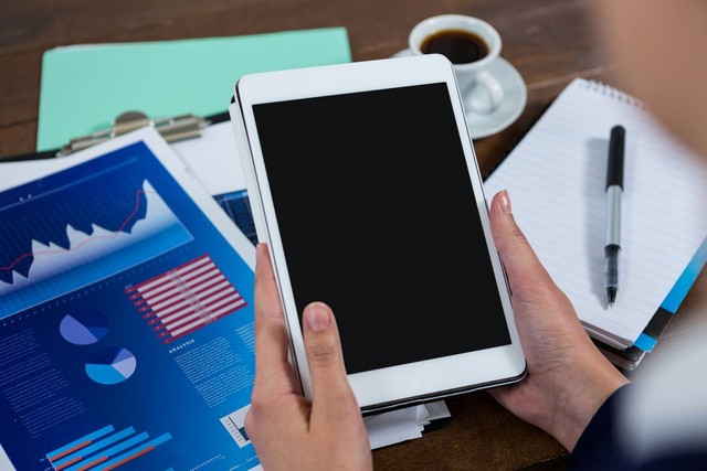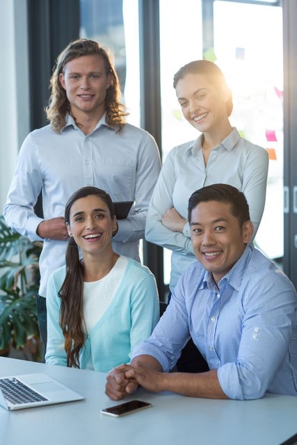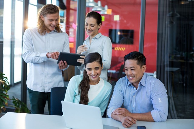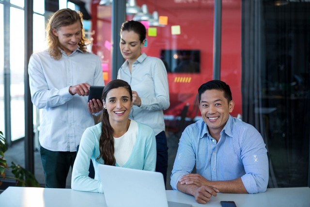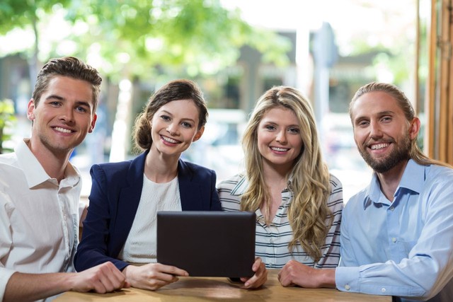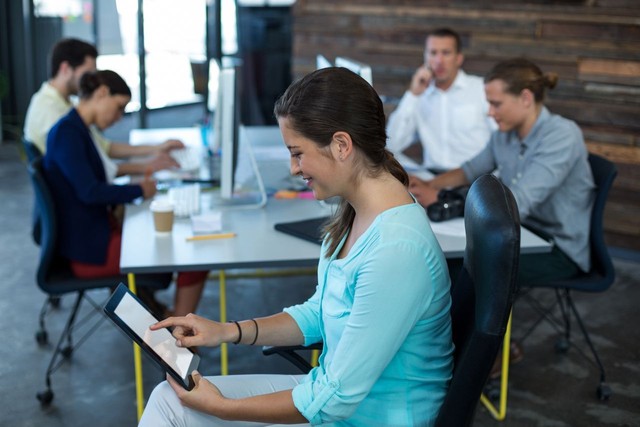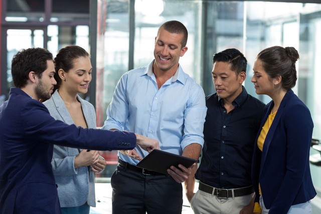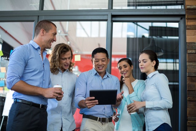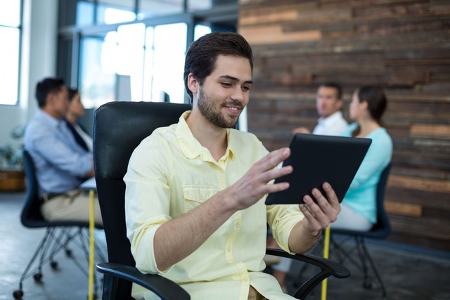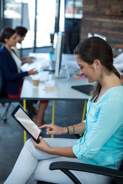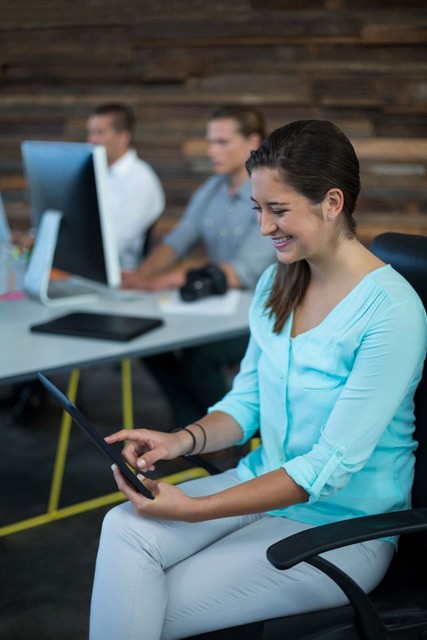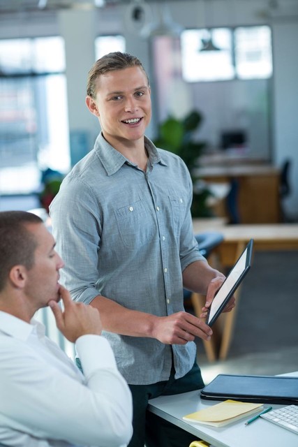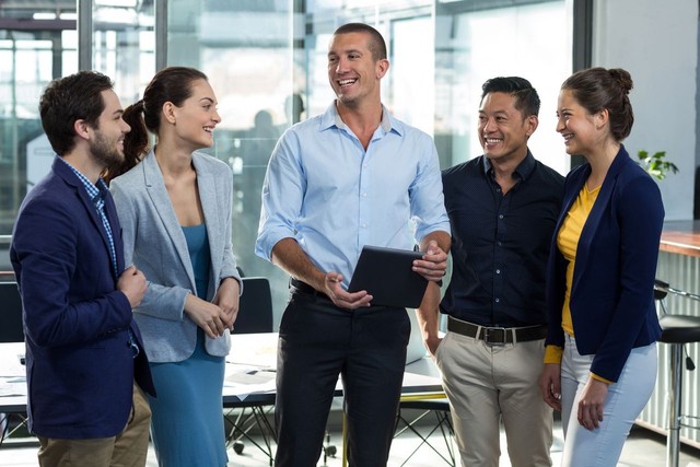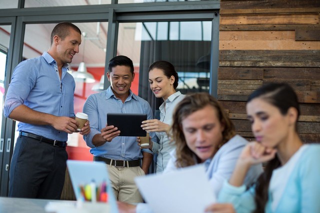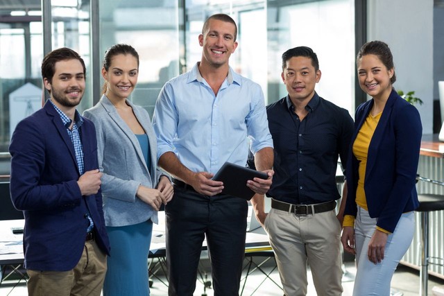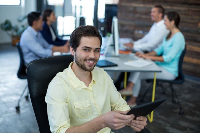 微笑的企业高管拿着数字平板电脑站在办公室里