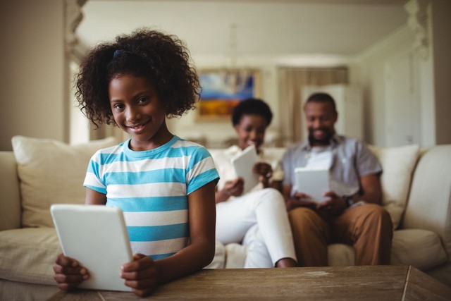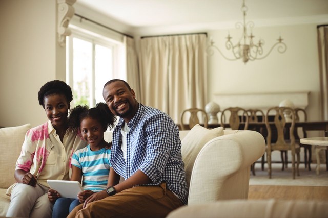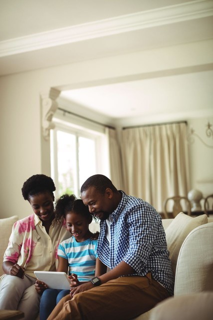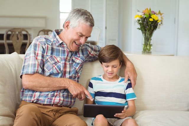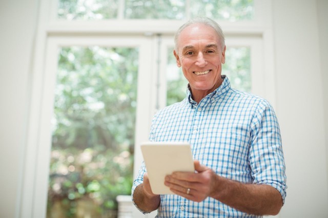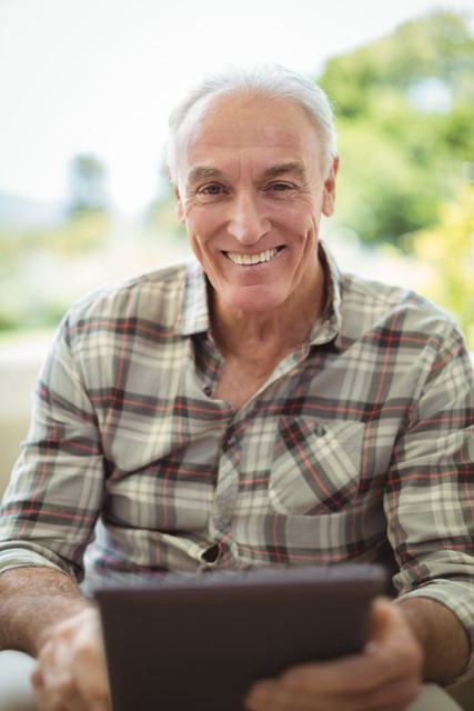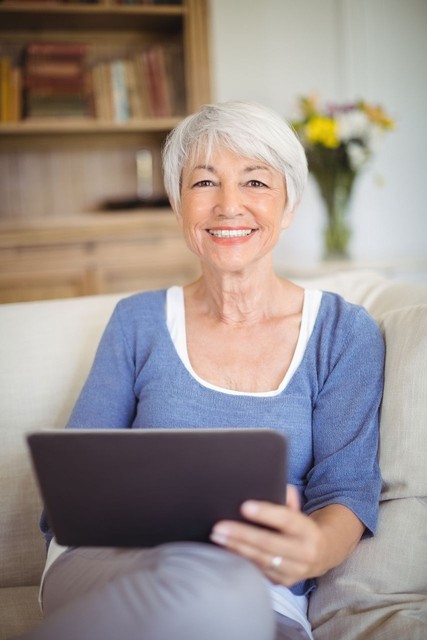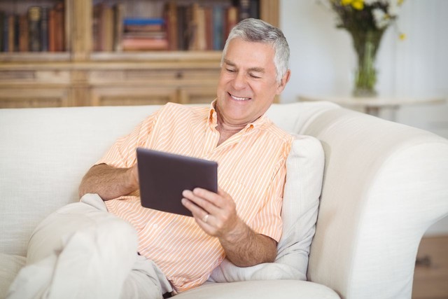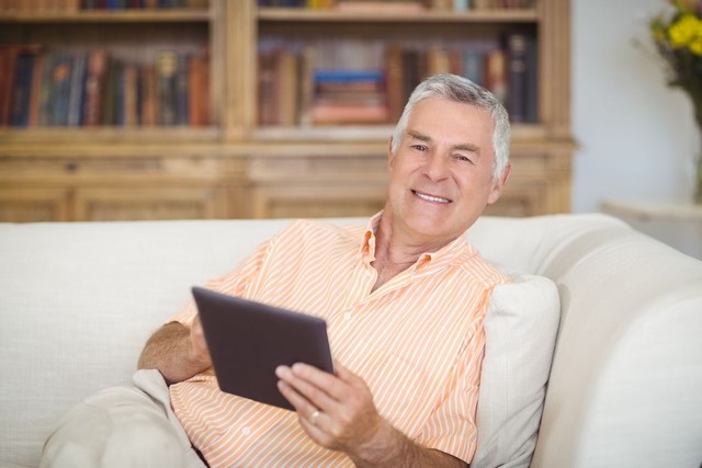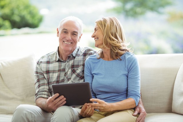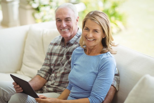 微笑的老年夫妇坐在沙发上,客厅里有数字平板电脑