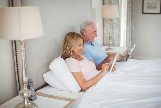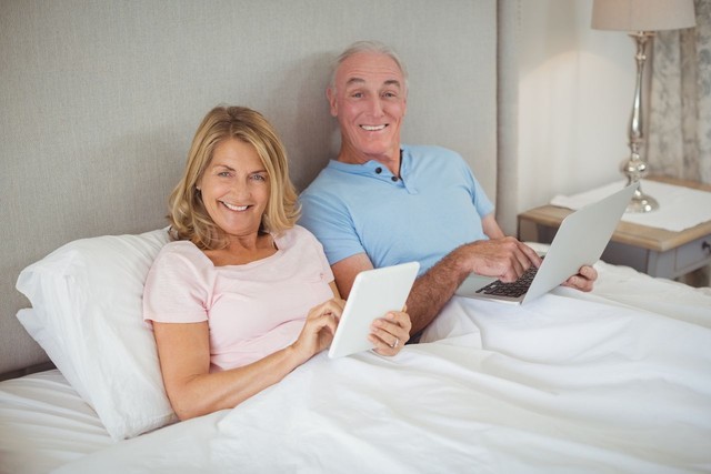 幸福的老年夫妇在床上使用笔记本电脑和数字平板电脑