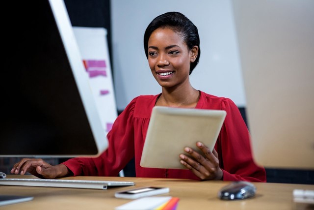 女人在电脑上工作,拿着数字平板电脑