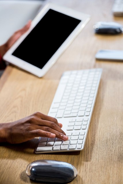 男人使用桌上有笔记本电脑的数字平板电脑