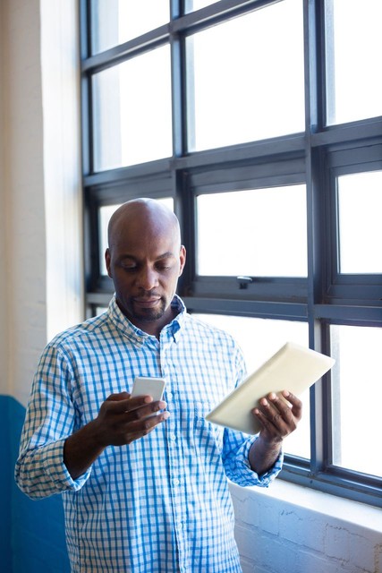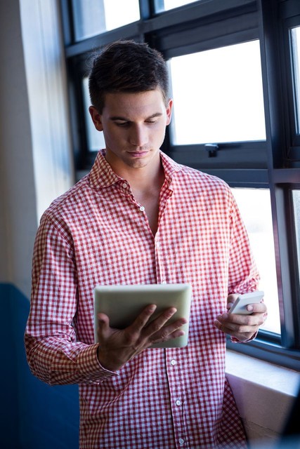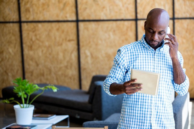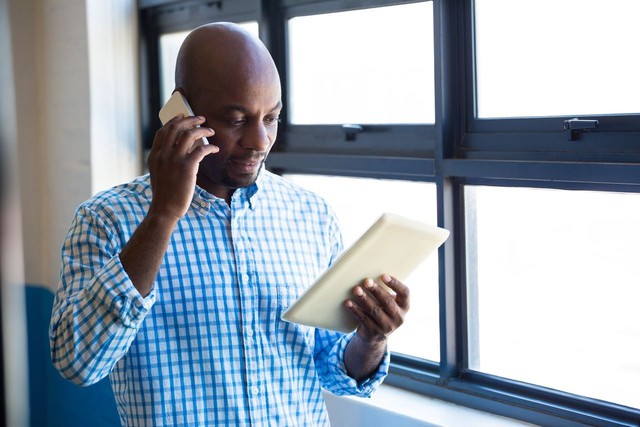 男人一边打电话一边看数字平板电脑