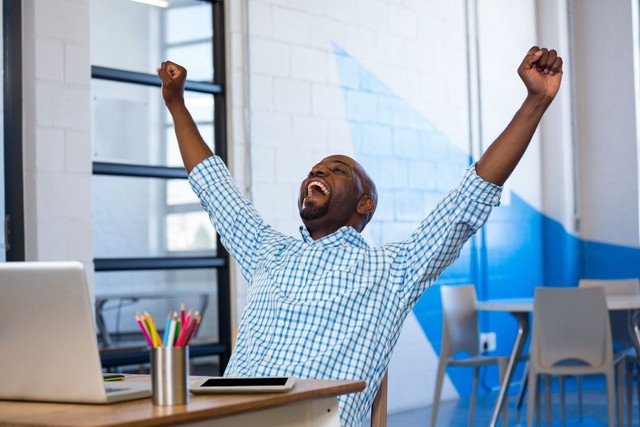 兴奋的男人坐在桌子上,手里拿着数字平板电脑和笔记本电脑
