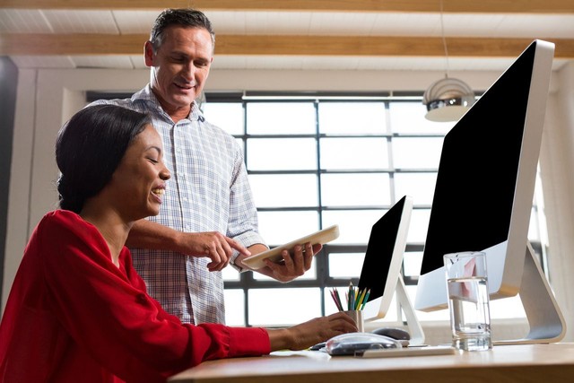 同事们看着数字平板电脑并讨论