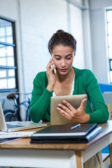 女人一边打电话一边看数字平板电脑