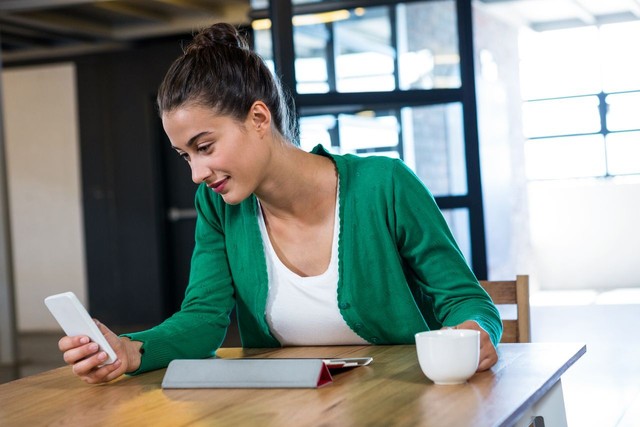 女人一边喝咖啡一边用手机发短信